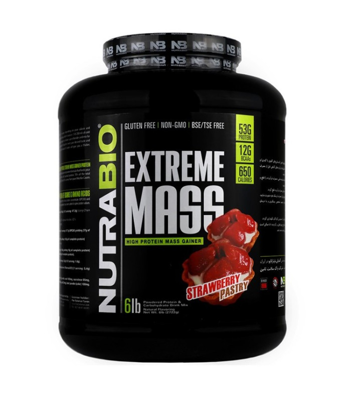NutraBio Mass Extreme یک گینر فوقالعاده پرکالری و حرفهایه که برای افراد سختوزن (Hardgainer) و ورزشکارهایی که نیاز به افزایش حجم و کالری بالاتر دارن طراحی شده.